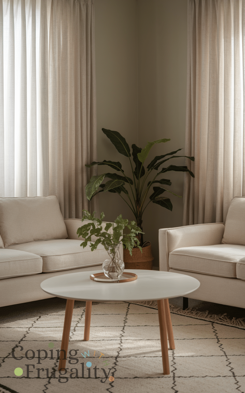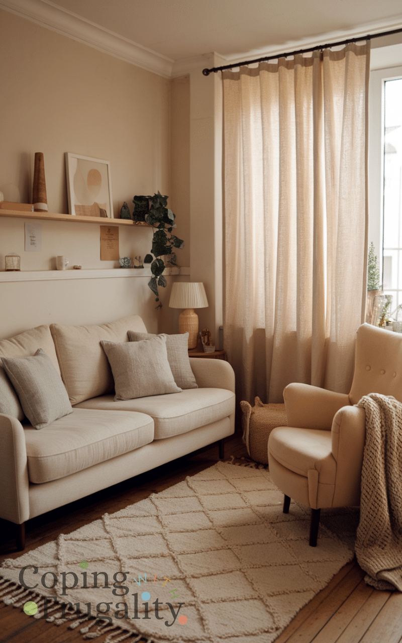 Light curtains are a beautiful detail that improves Cozy Small Living Room Decor without taking extra space. I always prefer sheer or linen curtains because they allow sunlight to enter naturally while still adding softness to the room. Natural light makes walls appear brighter and ceilings feel higher, which is perfect for compact spaces. Curtains in soft tones also connect furniture pieces visually and make the room feel complete. This simple addition creates a cozy feeling while keeping the atmosphere fresh and open.