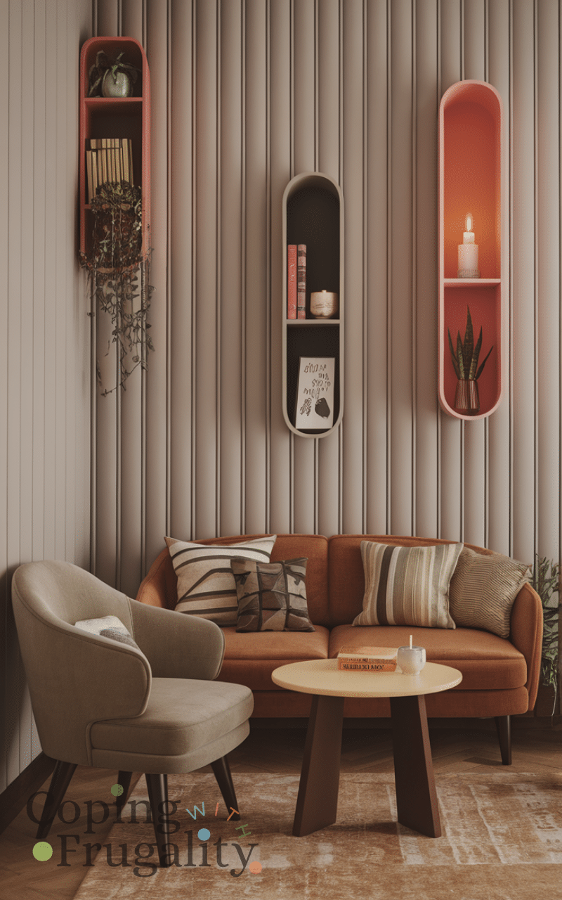 Vertical shelving works wonderfully in Cozy Small Living Room Decor because it uses wall space instead of floor space. I like adding slim shelves above sofas or near corners to display books, candles, or plants without overcrowding the room. These shelves keep the space organized while adding personality and charm. Displaying only a few favorite items keeps everything balanced and stylish. Using vertical space wisely helps small living rooms stay tidy and visually light while still feeling warm and expressive.