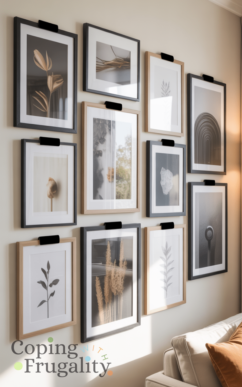 A gallery wall doesn’t require nails if you use removable hooks and strips. This is one of the most versatile Wall Decor Without Nails on a Budget ideas. You can hang photos, art prints, or small décor items and rearrange them easily. It gives you the look of a traditional gallery wall without the damage. Perfect for renters and anyone who loves flexible design.