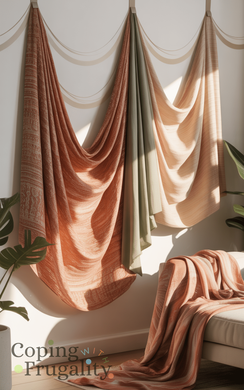 Lightweight fabric, scarves, or tapestries can completely transform a wall while keeping things affordable. Using adhesive hooks or removable strips supports Wall Decor Without Nails on a Budget without compromising style. Fabric adds warmth, texture, and color to any room. You can switch fabrics seasonally or based on your mood. This idea is especially great for boho, cozy, or minimalist interiors that need softness without heavy décor.