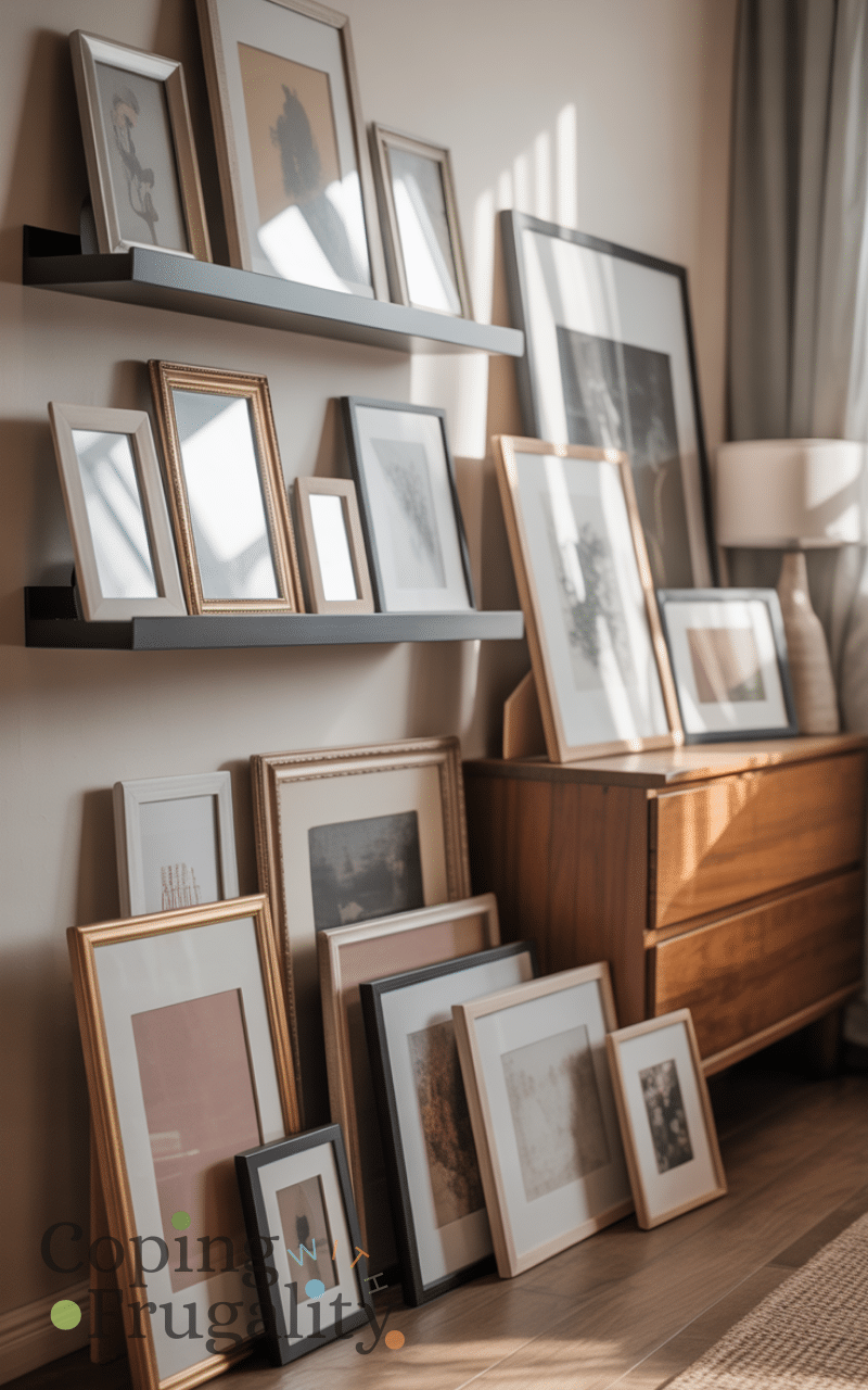 Instead of hanging frames, try leaning them against the wall on shelves, dressers, or even the floor. This method fits perfectly with Wall Decor Without Nails on a Budget because it requires zero hardware. You can layer frames of different sizes for a cozy, curated look. It’s also easy to rearrange whenever you want a change. This idea works beautifully in living rooms, bedrooms, and entryways where flexibility is key.