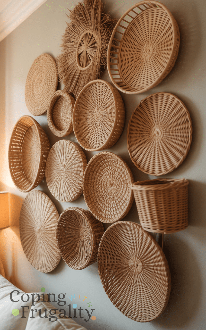 Decorative baskets add texture and warmth to walls without needing nails. Using strong adhesive hooks supports Wall Decor Without Nails on a Budget while keeping things stylish. Lightweight baskets can be arranged in clusters for a cozy, farmhouse-inspired look. This idea works well in living rooms, kitchens, or entryways. It’s an affordable way to add dimension without committing to permanent fixtures.