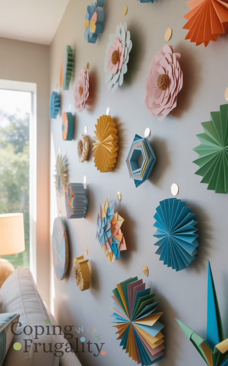 Paper wall art is one of the most creative Wall Decor Without Nails on a Budget ideas. You can make paper flowers, origami shapes, or layered designs using cardstock. Attach them with removable adhesive or sticky dots. This is a fun project for all ages and works well in kids’ rooms or creative spaces. It’s extremely affordable and lets you customize colors and patterns to match your décor.