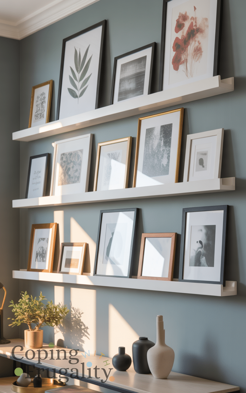 Picture ledges allow you to display art without attaching anything directly to the wall. This approach fits perfectly into Wall Decor Without Nails on a Budget because it’s flexible and stylish. You can swap prints anytime and layer frames for depth. Ledges can rest on furniture or adhesive-supported shelves. It’s a great solution for people who love changing their wall art frequently.