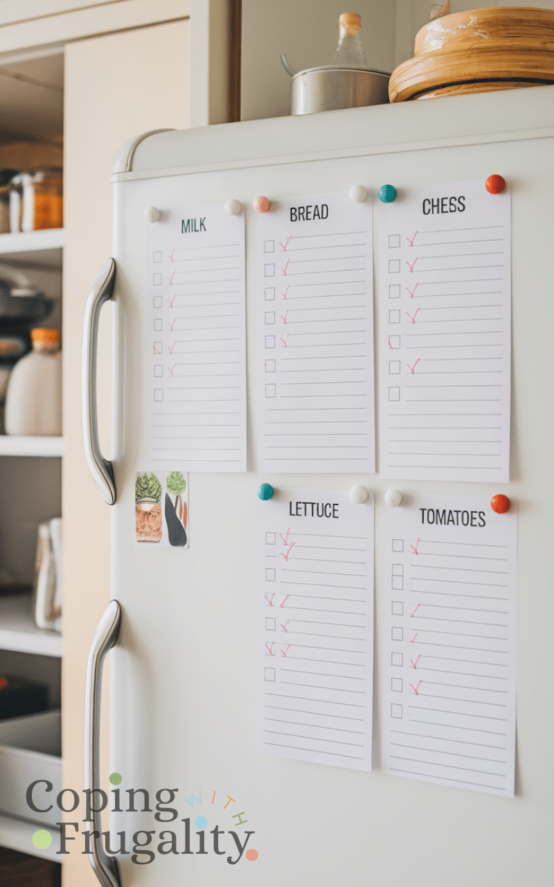 Keep a simple printable inventory on the fridge to track what you have. This fridge and pantry cleaning system on a budget reduces duplicate purchases and keeps your kitchen running smoothly.