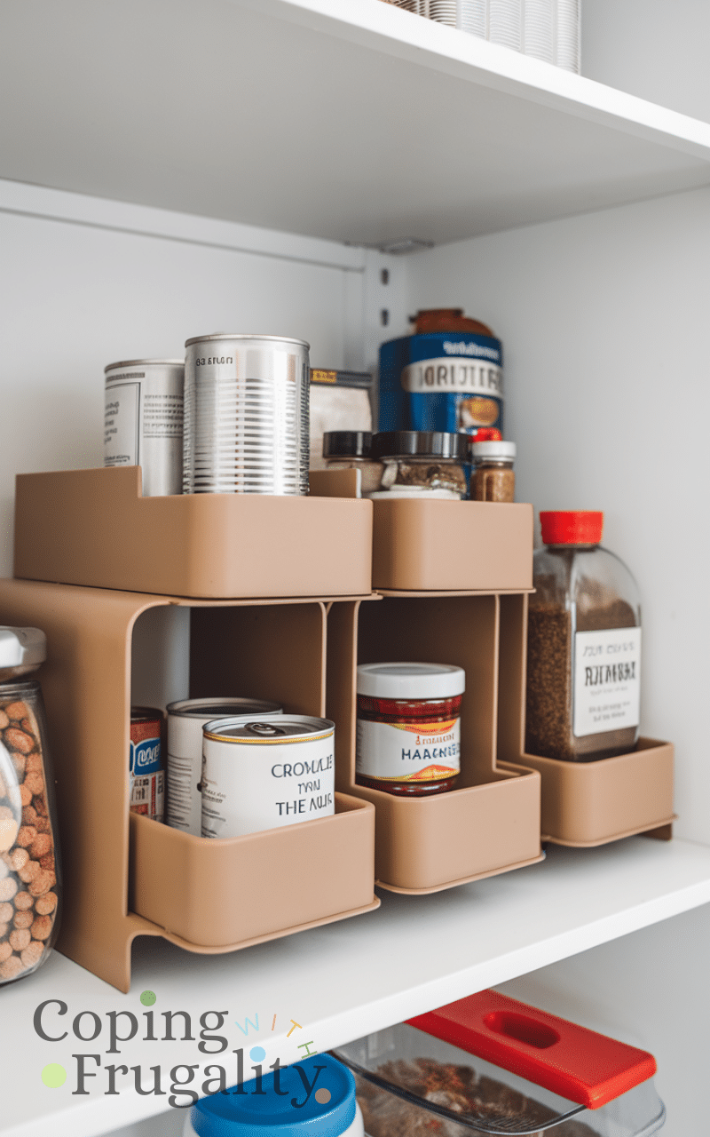 Tiered risers double storage space and improve visibility. Use them for cans, jars, or spices. This fridge and pantry cleaning system on a budget keeps items organized while saving money on extra containers.