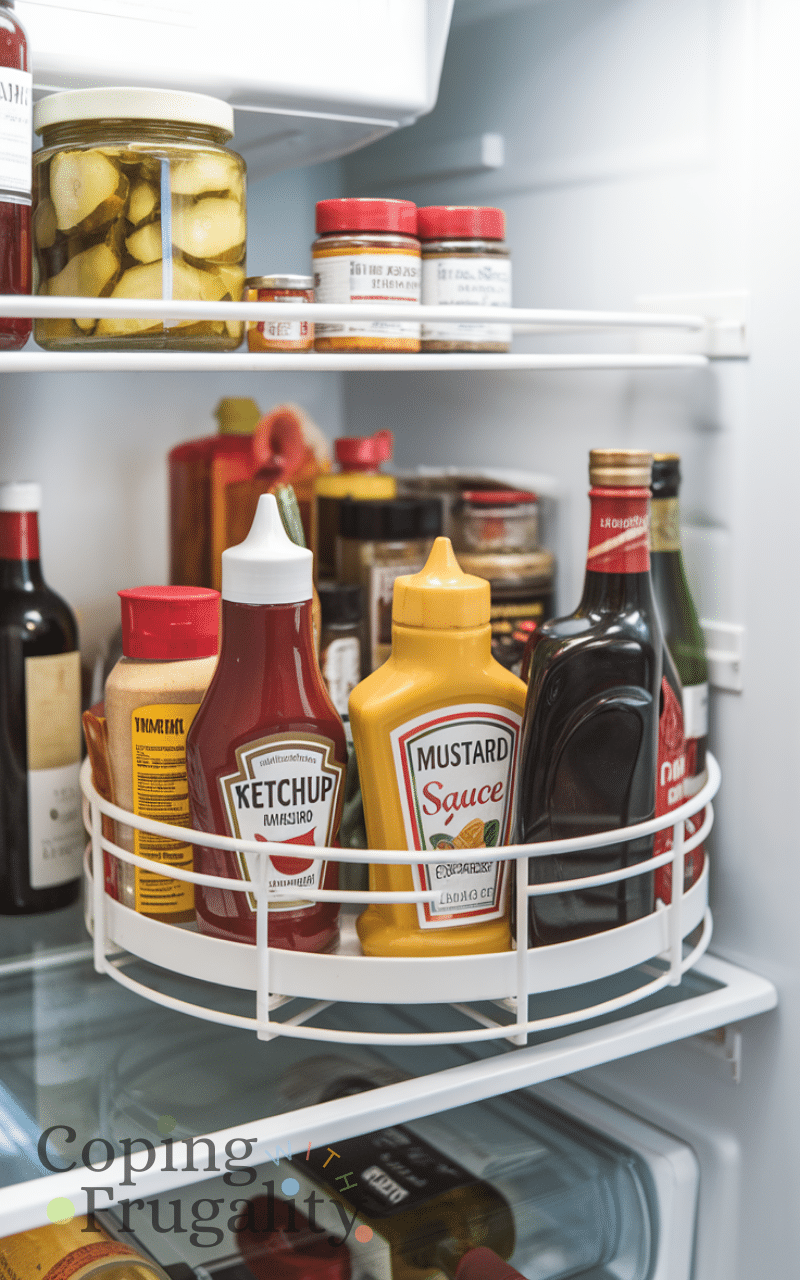Lazy Susans are perfect for condiments, sauces, or spices. They’re affordable and make accessing items easy. This fridge and pantry cleaning system on a budget maximizes space while keeping frequently used items within reach.