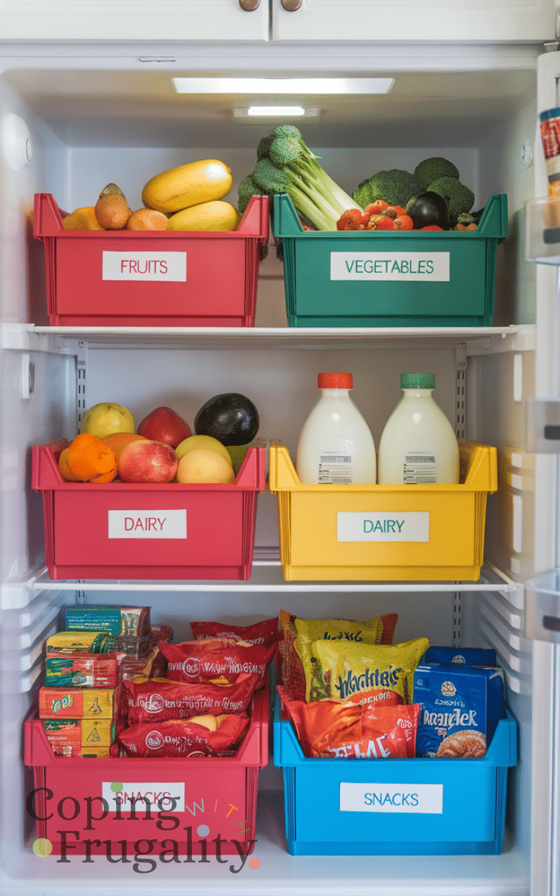 Assign zones for fruits, vegetables, dairy, and snacks using color-coded labels or bins. This fridge and pantry cleaning system on a budget helps everyone in the household know where things belong.