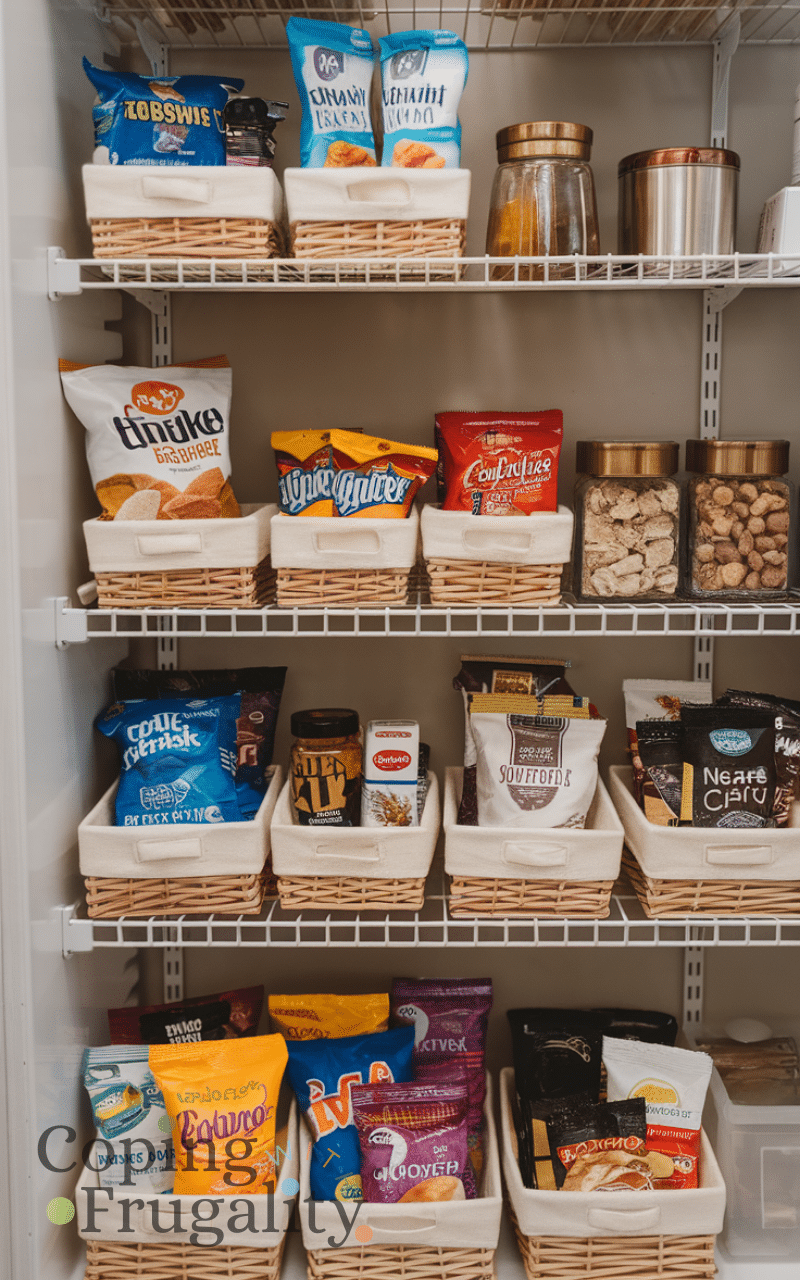 Use small baskets for chips, bars, or packets. This budget-friendly fridge and pantry cleaning system keeps snacks organized and prevents messy spills.