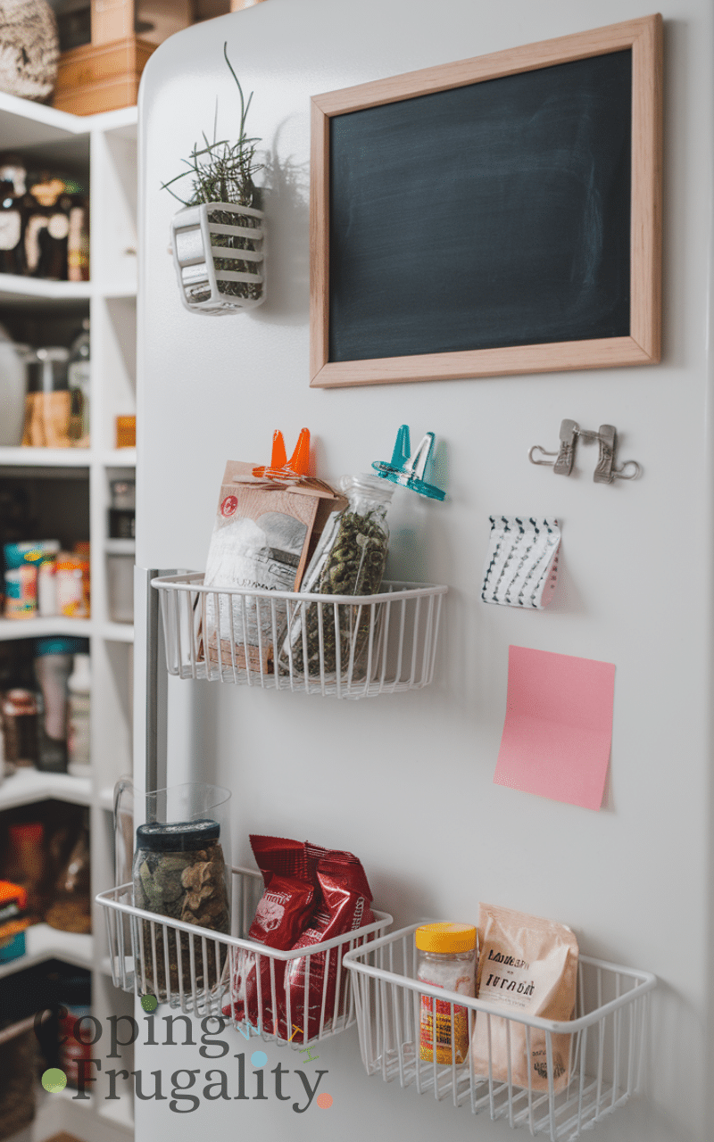 Magnetic clips or baskets can hold herbs, packets, or small items on the fridge door. This clever fridge and pantry cleaning system on a budget saves shelf space and keeps frequently used items handy.
