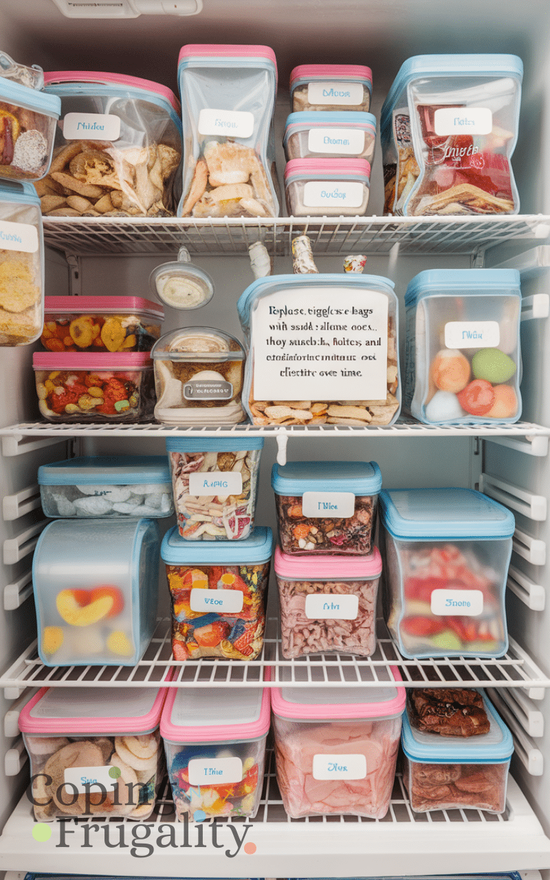 Replace single-use bags with reusable silicone ones. They store snacks, leftovers, or prepped ingredients. This fridge and pantry cleaning system on a budget is eco-friendly and cost-effective over time.