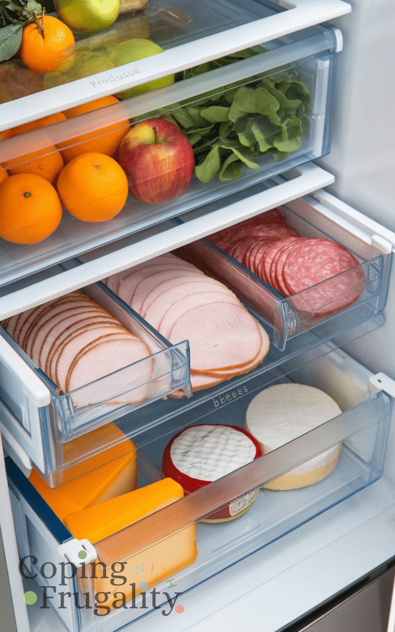 Divide fridge drawers for produce, deli meats, and cheeses. These budget-friendly dividers create a structured fridge and pantry cleaning system that keeps foods separate and reduces cross-contamination.