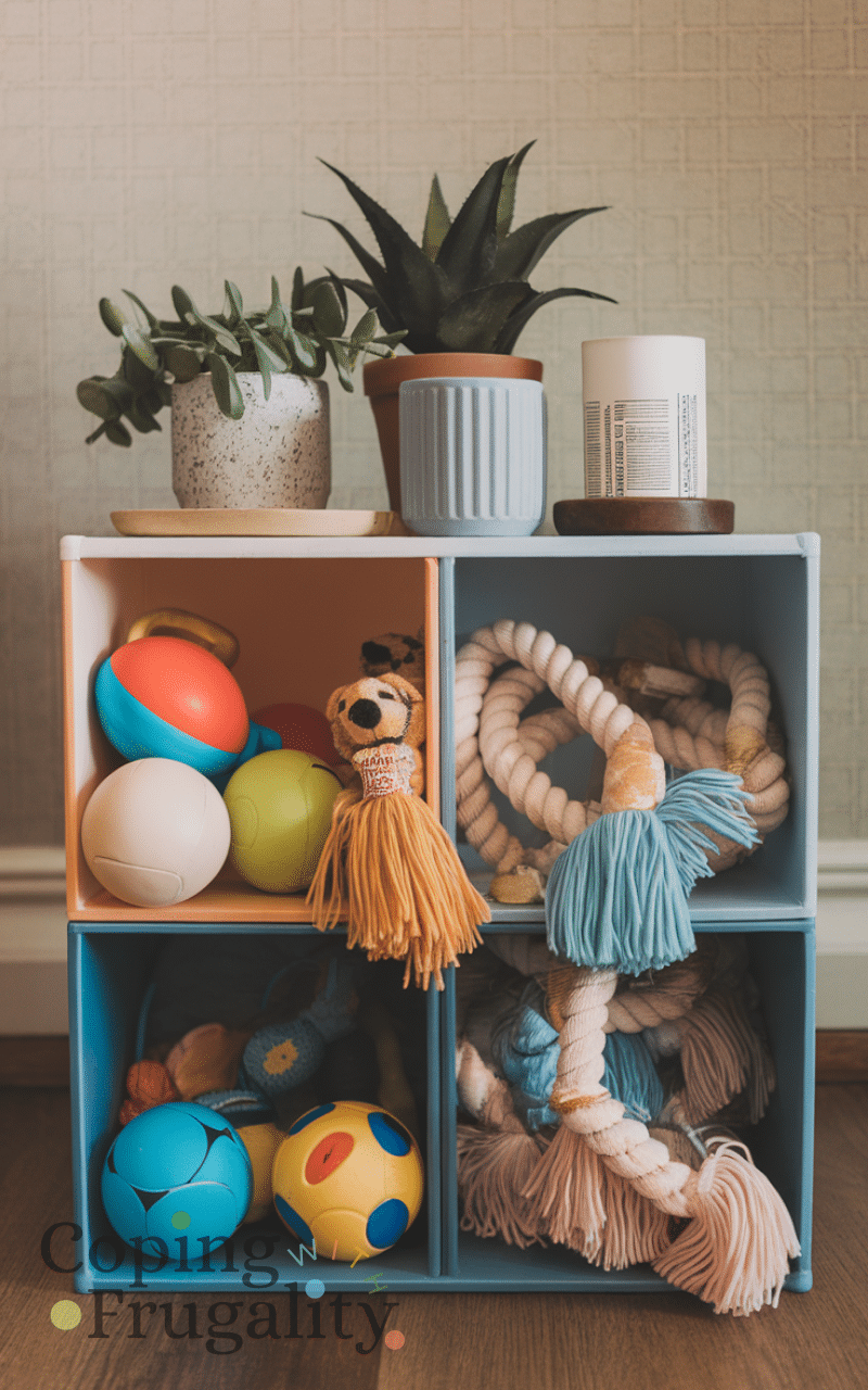 A storage cube with compartments is one of the best Dog Toy Storage Ideas for Small Homes on a Budget. It allows you to separate toys neatly and even mix dog storage with household items. Affordable and compact, it’s ideal for small homes that need smart organization solutions.