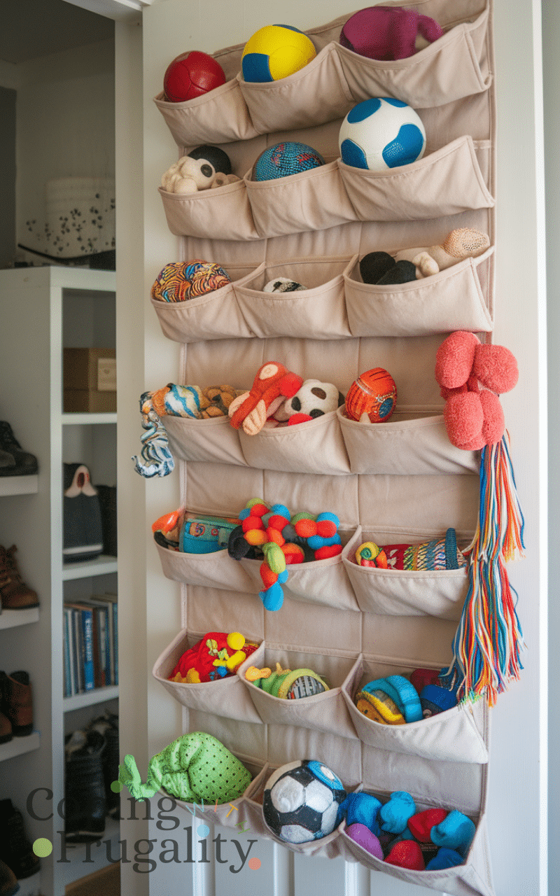 An over-the-door shoe organizer is a creative Dog Toy Storage Idea for Small Homes on a Budget. Each pocket can hold balls, chew toys, or ropes. It keeps toys organized vertically, which is perfect for tight spaces. This option is inexpensive and easy to install without damaging walls.