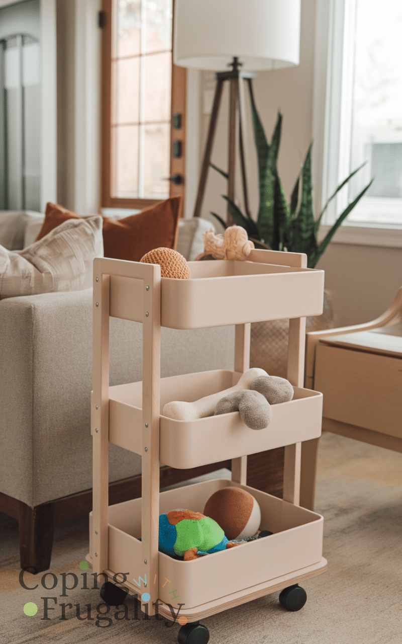 A rolling cart is a flexible Dog Toy Storage Idea for Small Homes on a Budget. You can move it from room to room and store toys on different levels. These carts are affordable and perfect for small spaces where storage needs may change frequently.