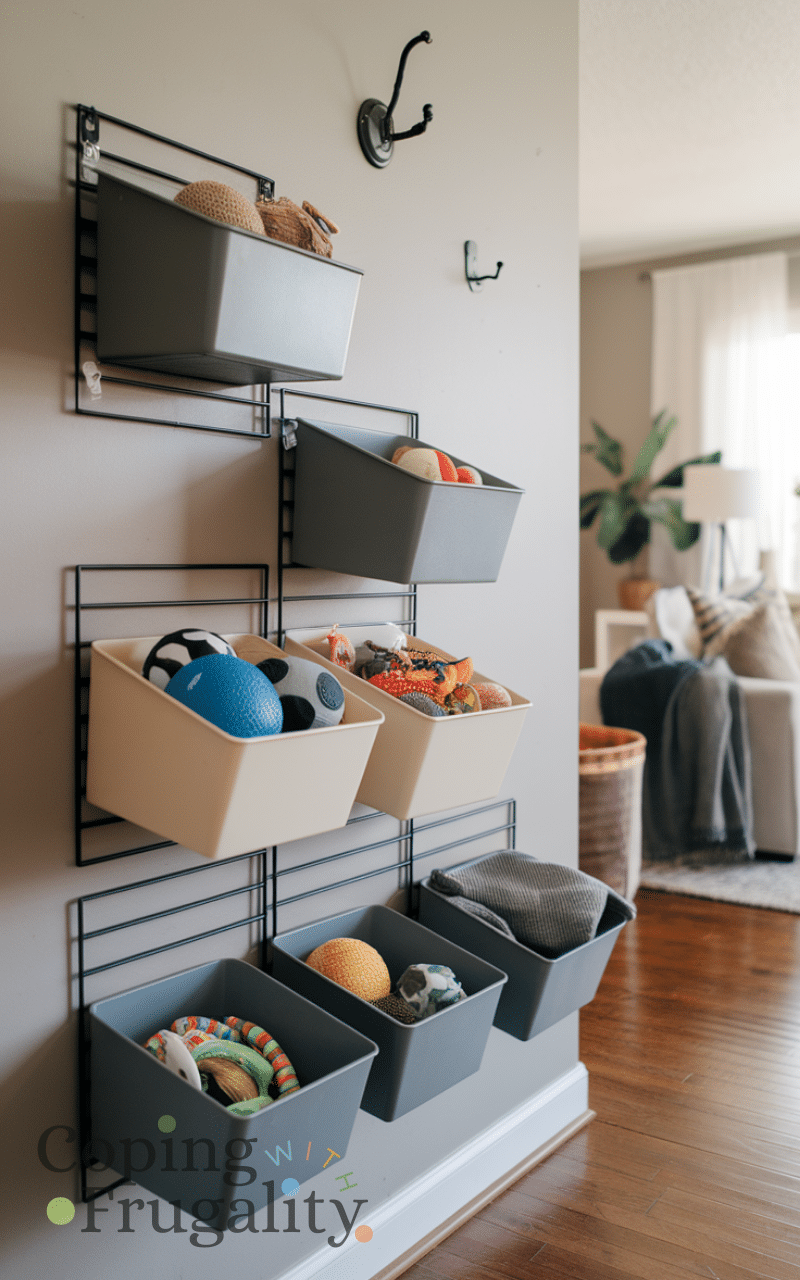Wall-mounted baskets are excellent Dog Toy Storage Ideas for Small Homes on a Budget because they save floor space. You can hang wire or fabric baskets on hooks or rails. This keeps toys organized, visible, and easy to grab. It also adds a decorative touch to small homes while preventing toys from spreading across the room.