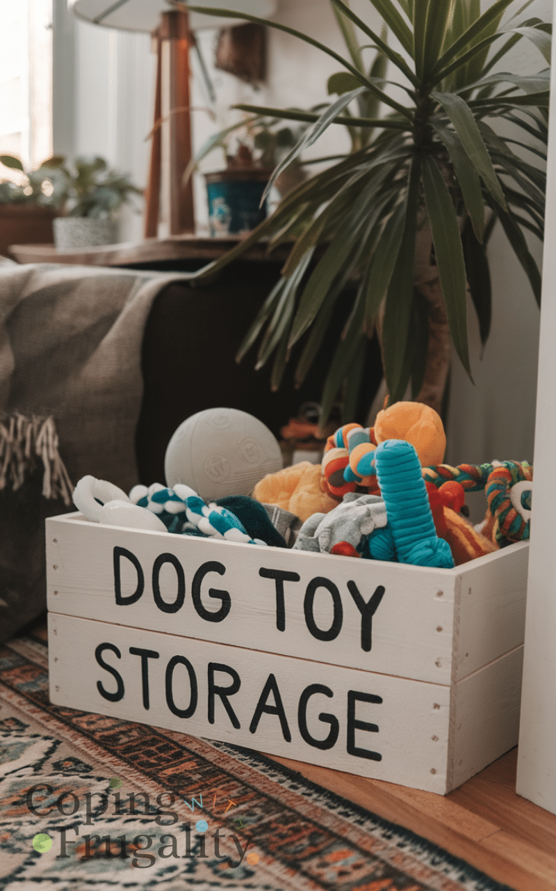 A small DIY wooden box is a classic Dog Toy Storage Idea for Small Homes on a Budget. You can build or repurpose one using scrap wood. Paint it to match your decor and place it in a corner. It’s durable, affordable, and adds a personal touch to your home.
