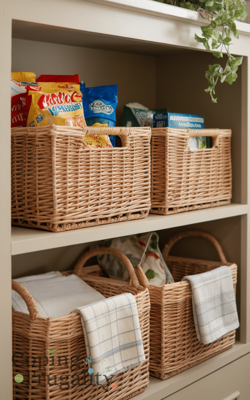 Under-shelf baskets are a clever Mini Kitchen Storage solution that adds hidden storage instantly. I like placing them beneath existing shelves to hold snacks, napkins, or kitchen cloths. This Mini Kitchen Storage method uses space that normally stays empty and turns it into something helpful. It keeps lightweight items organized while improving cabinet efficiency. These baskets are simple but very effective in compact kitchens.
