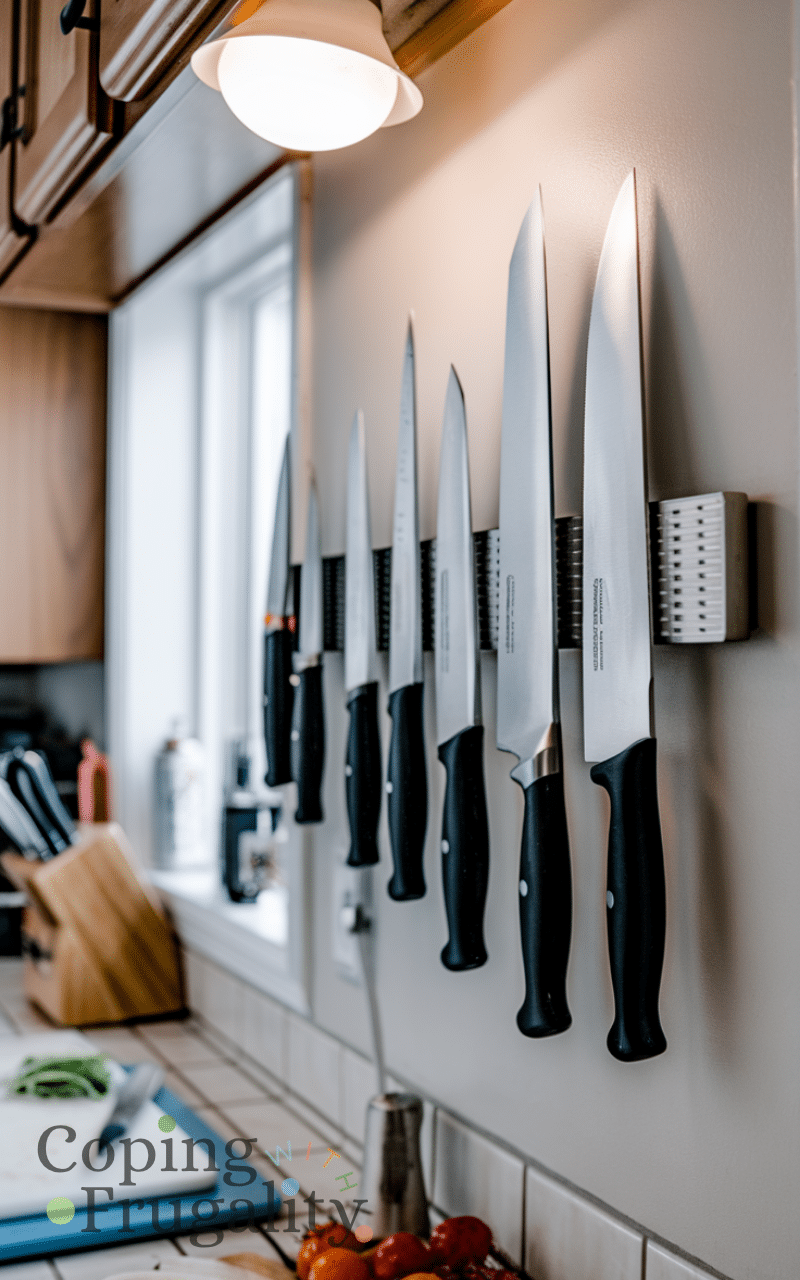 Magnetic strips are a creative way to save counter space instantly. I like how they keep knives safe while also making them easy to access during cooking. They remove the need for bulky knife blocks and create a cleaner workspace. When installed near prep areas, they improve both organization and efficiency. They also add a modern touch that fits beautifully into compact kitchens.
