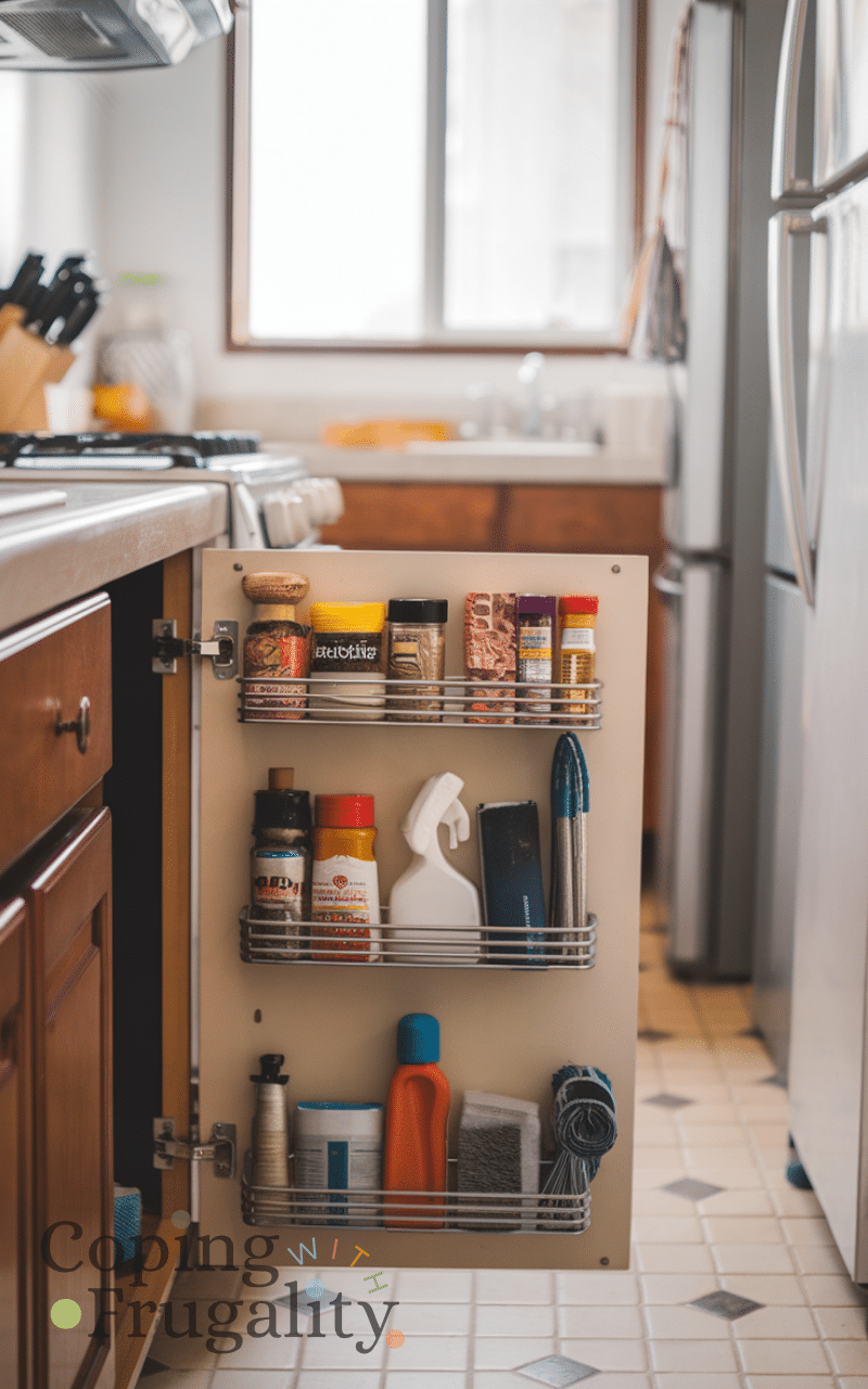 Using the back of doors is a smart trick that many people forget. I enjoy placing small racks or hooks behind cabinet doors to store spices, wraps, or cleaning tools. This simple idea helps free shelves and drawers without changing the kitchen layout. It also keeps small items grouped together so they are easier to find quickly. Even pantry doors can become helpful storage areas with a few hanging organizers added inside.