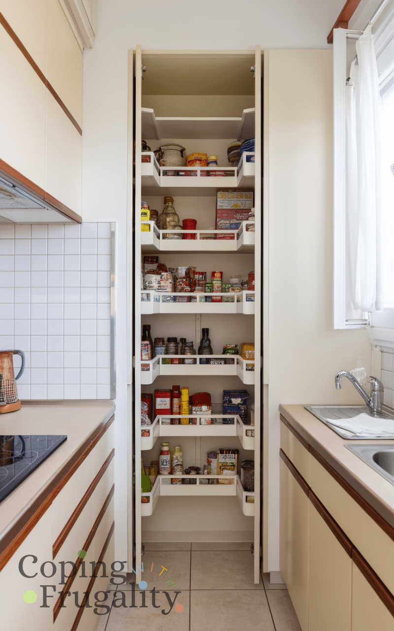 Tall narrow pantry cabinets are perfect Mini Kitchen Storage additions for tight kitchens. I enjoy how they use vertical space instead of floor space, making kitchens feel larger. This Mini Kitchen Storage option keeps dry foods grouped and easy to reach. It also creates a dedicated storage area without needing major renovation. Even small kitchens benefit greatly from vertical pantry solutions.
