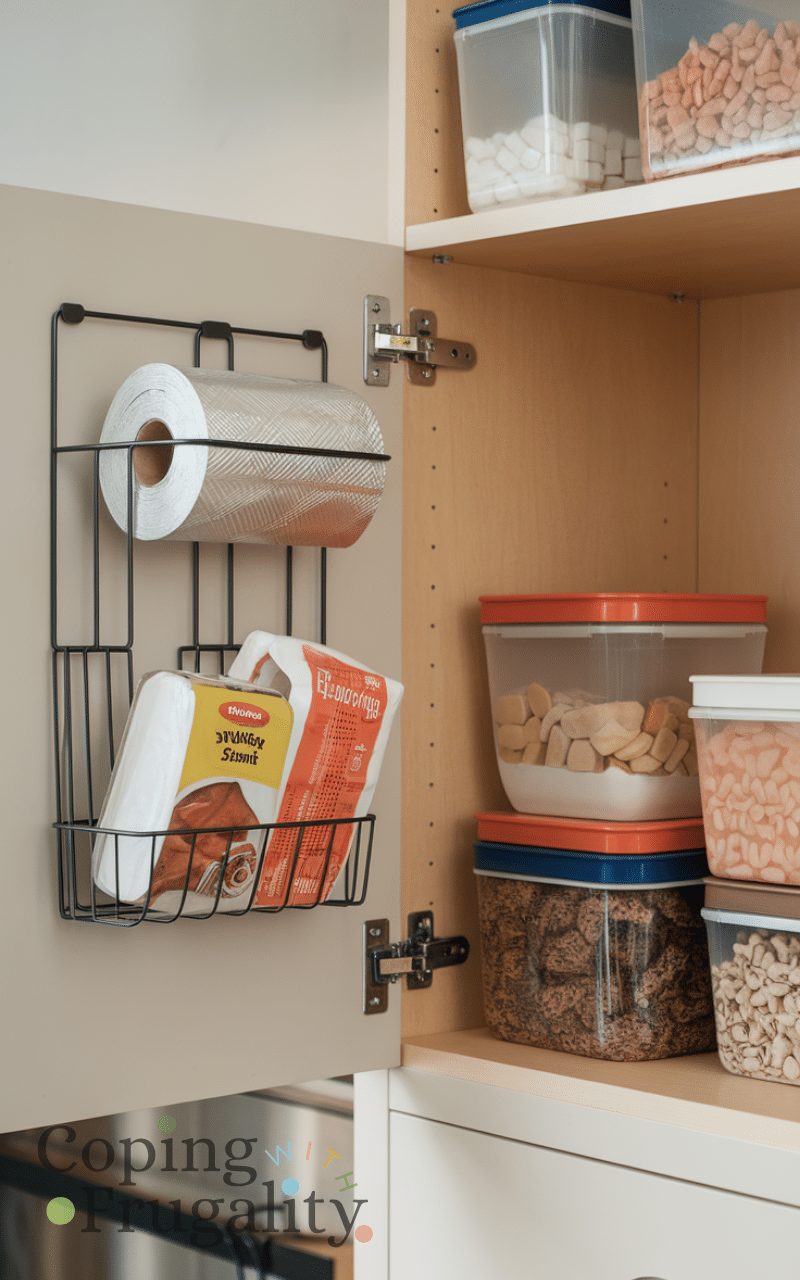 Cabinet door holders are a hidden Mini Kitchen Storage solution that improves organization without changing layout. I like using them for foil, wraps, or cleaning supplies that usually take shelf space. This Mini Kitchen Storage idea keeps items grouped neatly while freeing cabinets for larger containers. It also helps maintain a clean and balanced kitchen look. Small holders often create surprisingly large storage improvements.