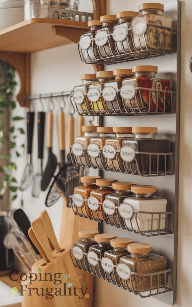 Vertical spice racks are a smart Mini Kitchen Storage solution for keeping flavors organized. I find they help save drawer space while making spices easier to locate quickly. This Mini Kitchen Storage method also keeps cooking faster because everything stays visible. Slim racks can fit inside cabinet doors or narrow wall sections easily. Organized spices always make kitchens feel calmer and more efficient.