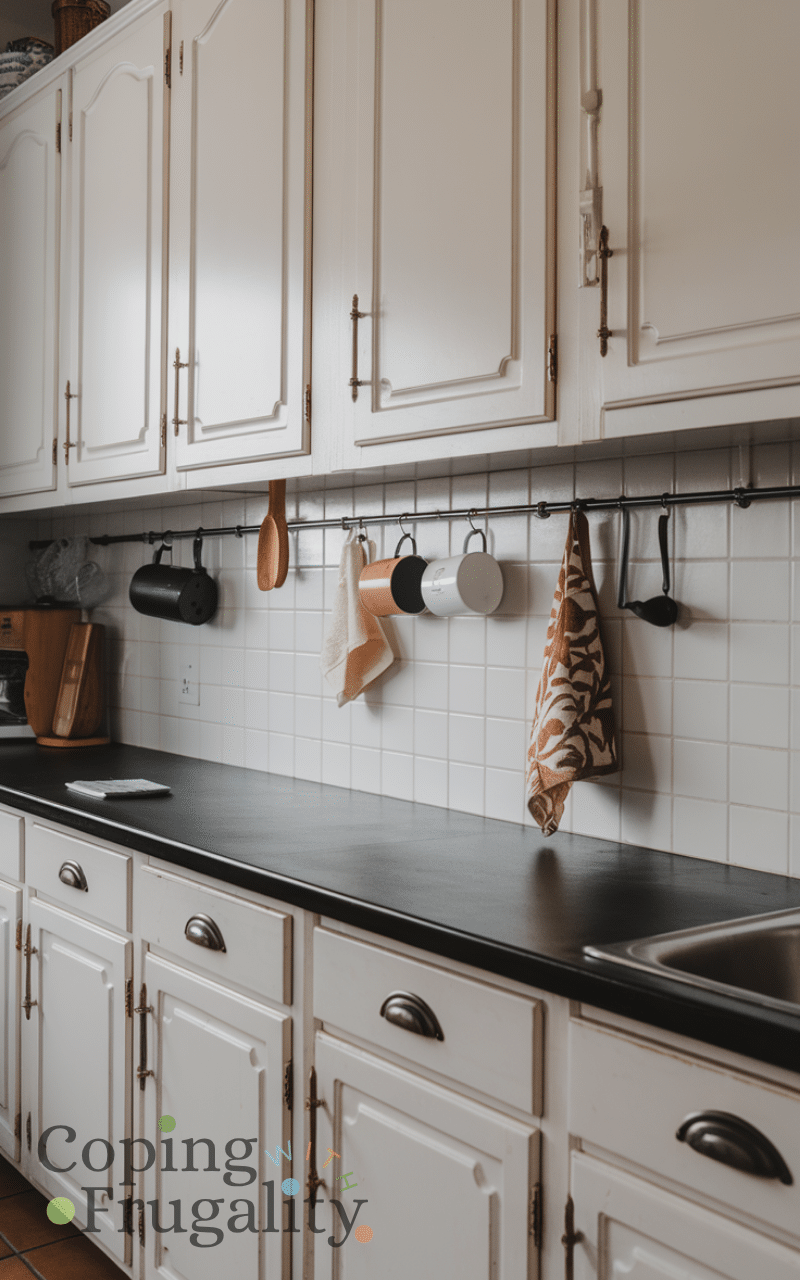 Adding hooks beneath cabinets is one of the simplest Mini Kitchen Storage tricks I recommend. I like hanging mugs, utensils, or towels in these small spaces to reduce drawer crowding. This Mini Kitchen Storage idea keeps essentials close without making surfaces messy. It also adds charm and warmth to the kitchen atmosphere. Even a few hooks can create surprisingly helpful storage.