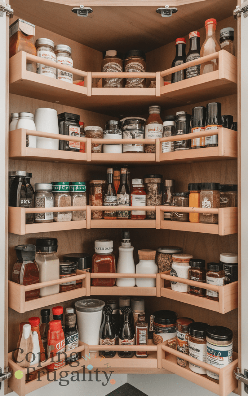 Corner cabinets often waste space, but Lazy Susans turn them into smart Mini Kitchen Storage areas. I like how rotating trays make everything easier to reach without moving other items. This Mini Kitchen Storage trick keeps jars and bottles visible while preventing deep cabinet clutter. It also helps organize categories like sauces or spices neatly. Even small corners become useful when rotation storage is added.