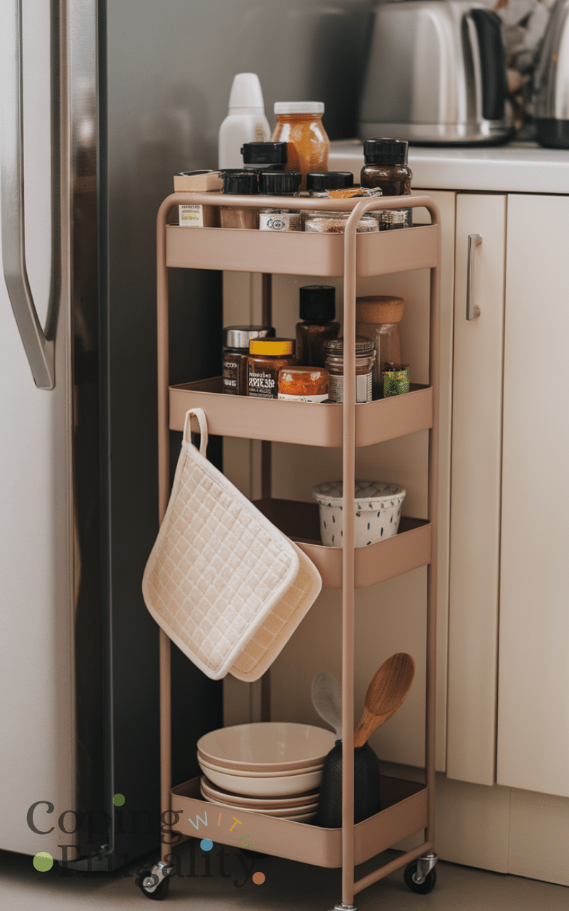 Slim rolling carts are one of the most flexible Mini Kitchen Storage ideas I use in tight spaces. I find they fit perfectly between appliances or cabinets and provide extra shelves without permanent installation. This Mini Kitchen Storage solution can hold spices, bottles, or small tools that need to stay nearby. Because the cart moves easily, it adapts to changing kitchen needs. It also works well as extra prep support during busy cooking times.