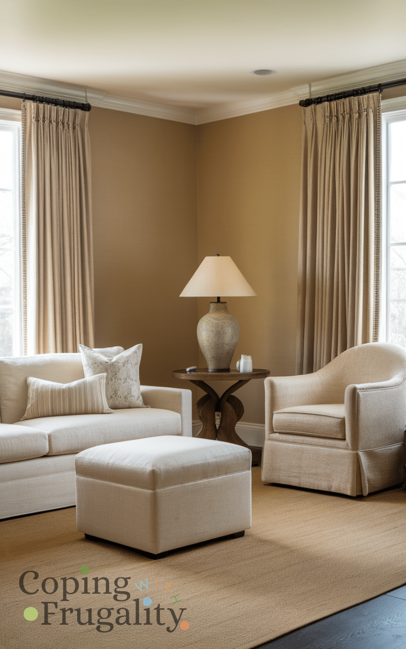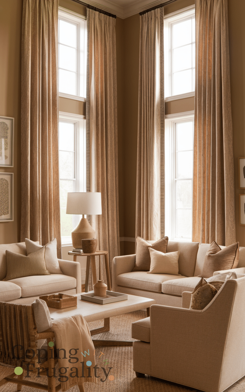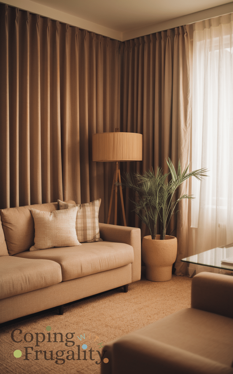 Curtains play a huge role in Warm Beige Home Decor on a Budget because they control light and mood. Beige curtains soften natural light and add warmth without overwhelming the space. Opt for lightweight fabrics like cotton or polyester blends for an airy look. Installing curtains higher than the window can make ceilings feel taller, giving your room a more elegant and expensive appearance for very little cost.