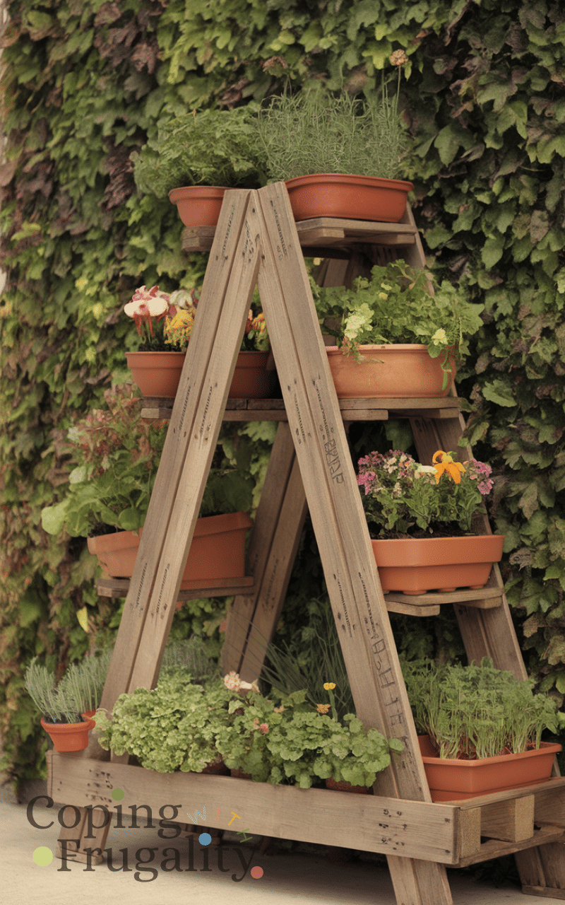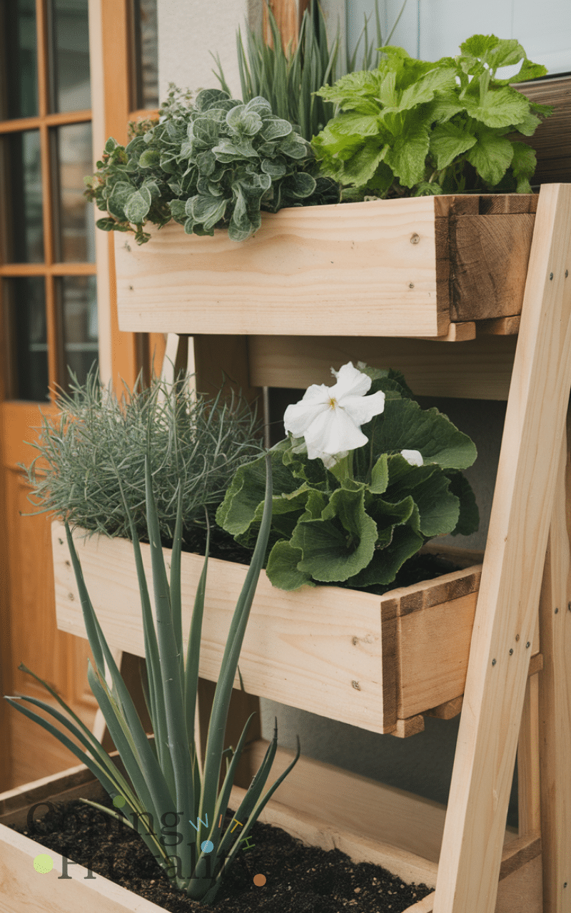 Ladder-style arrangements are stylish Best Wood Pallet Planters that create a vertical garden effect with very little effort. I enjoy placing pots on each step to create a layered plant arrangement. This design works beautifully for flowers and herbs together. It also makes watering easier because plants stay organized at different heights. Ladder planters fit nicely against walls or fences and add structure to outdoor layouts. With a simple frame and creative placement, they quickly become one of the most decorative pallet planter ideas for small gardens.