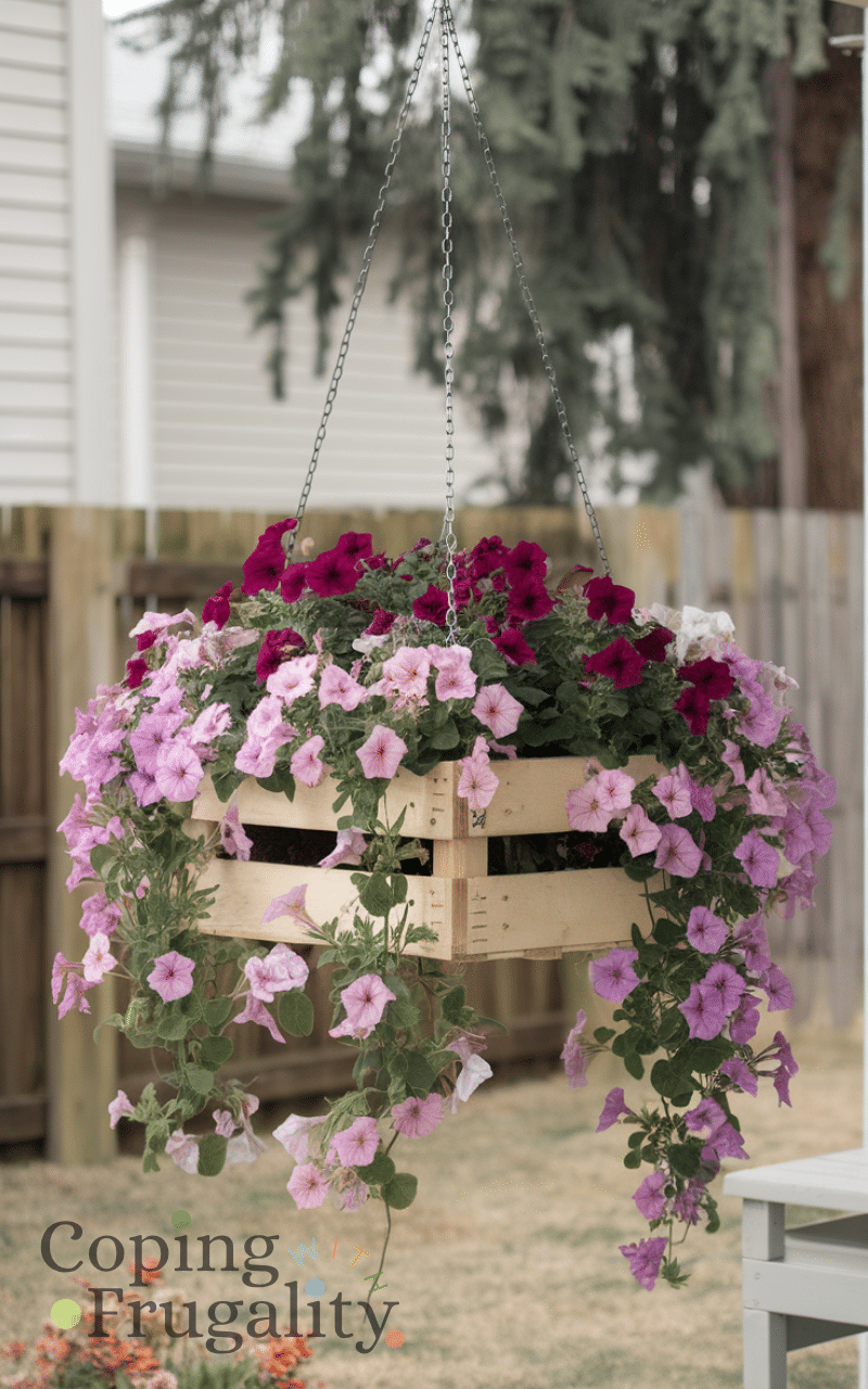 A hanging flower design is one of the prettiest Best Wood Pallet Planters I like using for decorating porches and fences. It creates a soft waterfall effect when colorful flowers grow over the edges. I usually choose petunias or trailing plants for this style because they naturally drape beautifully. This planter also helps brighten empty outdoor walls and adds personality to entrances. Hanging pallets are easy to install and perfect for small areas where floor space is limited. With a little creativity, they quickly become a cheerful focal point in any outdoor corner.