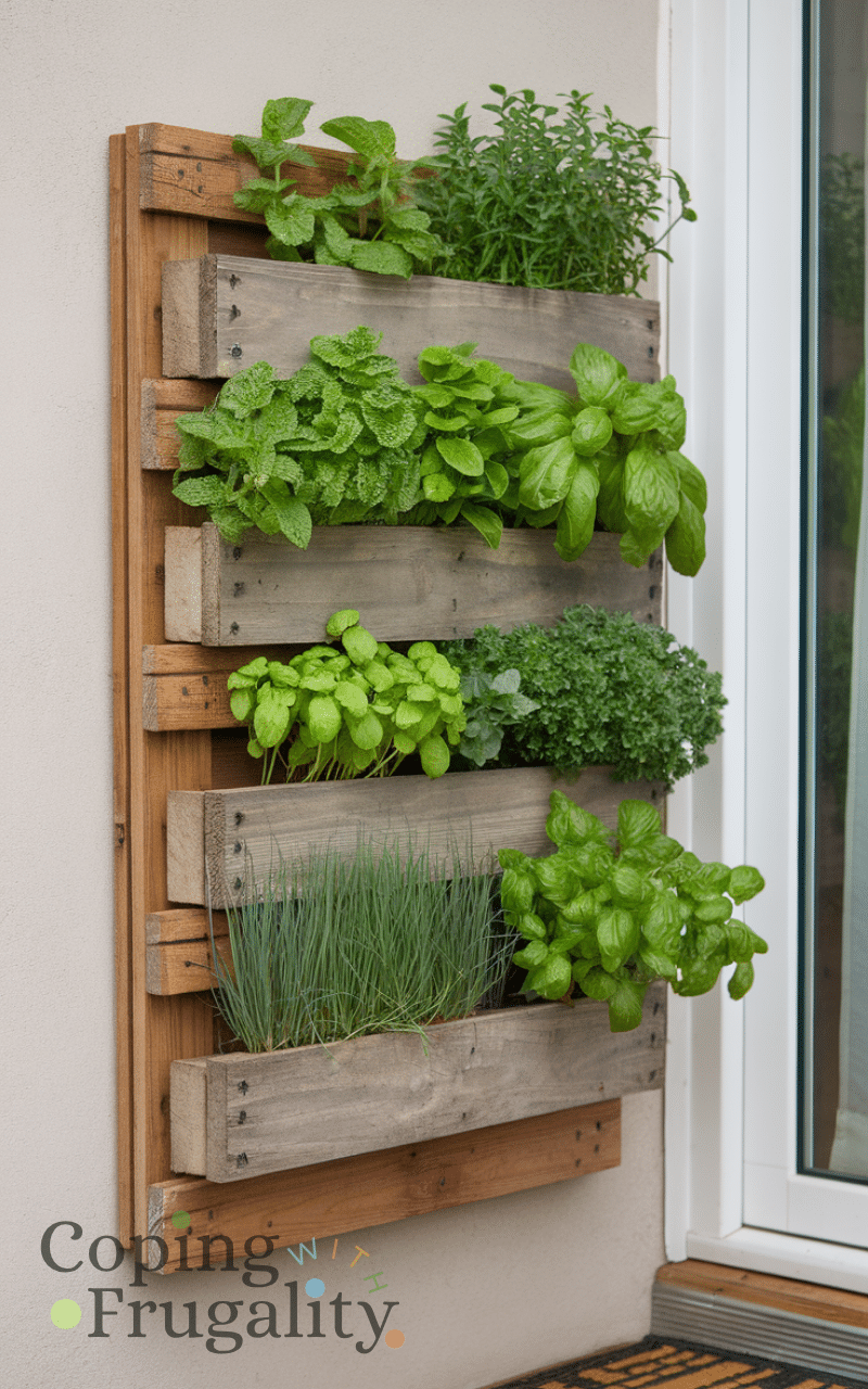 A vertical wall herb setup is one of my favorite Best Wood Pallet Planters because it saves space while keeping herbs within easy reach. I like placing it near the kitchen door or balcony wall so fresh mint, basil, and parsley are always close by. This planter style works beautifully in small spaces and adds a fresh green accent to plain walls. It also helps organize plants neatly without cluttering the ground. With a little soil lining and proper watering, this vertical design transforms recycled wood into a practical garden feature that looks charming and modern.