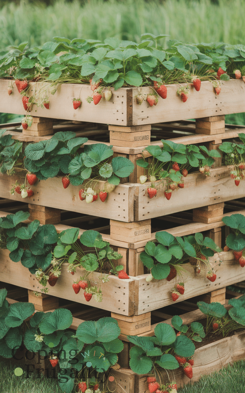 Strawberry containers are fun Best Wood Pallet Planters that make harvesting fresh fruit easier and cleaner. I like this design because strawberries grow well in stacked pockets and stay off the ground. This helps protect them from pests and keeps fruits fresh. The layered pallet structure allows several plants to grow in a small area. It also creates a decorative display with bright green leaves and red berries. With proper sunlight and watering, this planter style becomes both productive and visually attractive in any home garden.