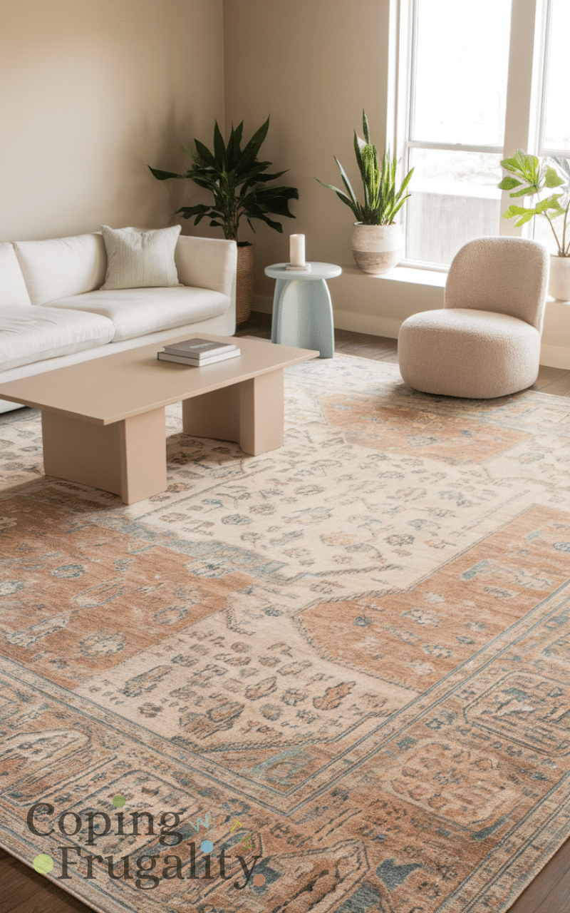 Instead of layering multiple small rugs, invest in one large area rug to anchor your furniture and add texture. This simple strategy works perfectly for decorating with fewer items on a budget. A well-chosen rug can define the space, tie colors together, and make your room feel finished without extra accessories.