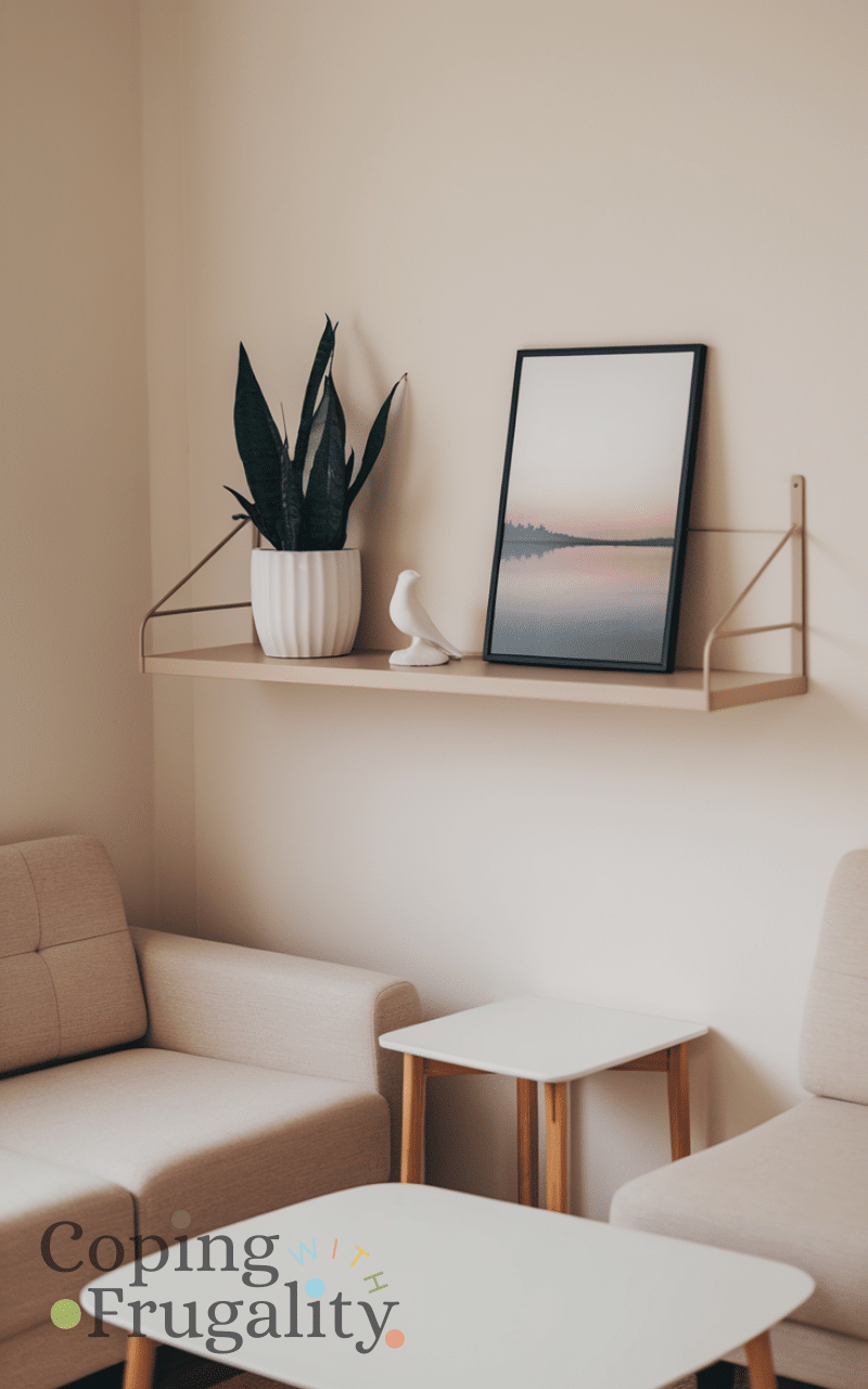 Floating shelves can display a few cherished items like a plant, a photo frame, or a small sculpture. In decorating with fewer items on a budget, it’s better to showcase selected pieces instead of cluttering the shelf. This approach creates visual interest and keeps your space feeling open and airy, emphasizing quality over quantity.