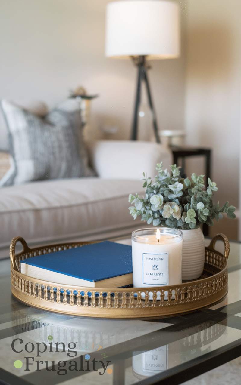 Decorative trays are versatile and budget-friendly accents. Use a single tray on a coffee table or dresser to hold candles, books, or small plants. This strategy embodies decorating with fewer items on a budget because it organizes essentials while adding style. By grouping items neatly, a tray reduces visual clutter and gives the impression of a well-thought-out design with minimal pieces.