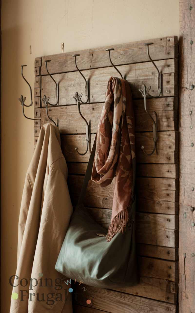 Wall hooks can serve both function and style. Hang a decorative coat, bag, or scarf to reduce the need for multiple storage or decor pieces. In decorating with fewer items on a budget, functional decor like hooks saves space and keeps your room tidy while adding visual interest.
