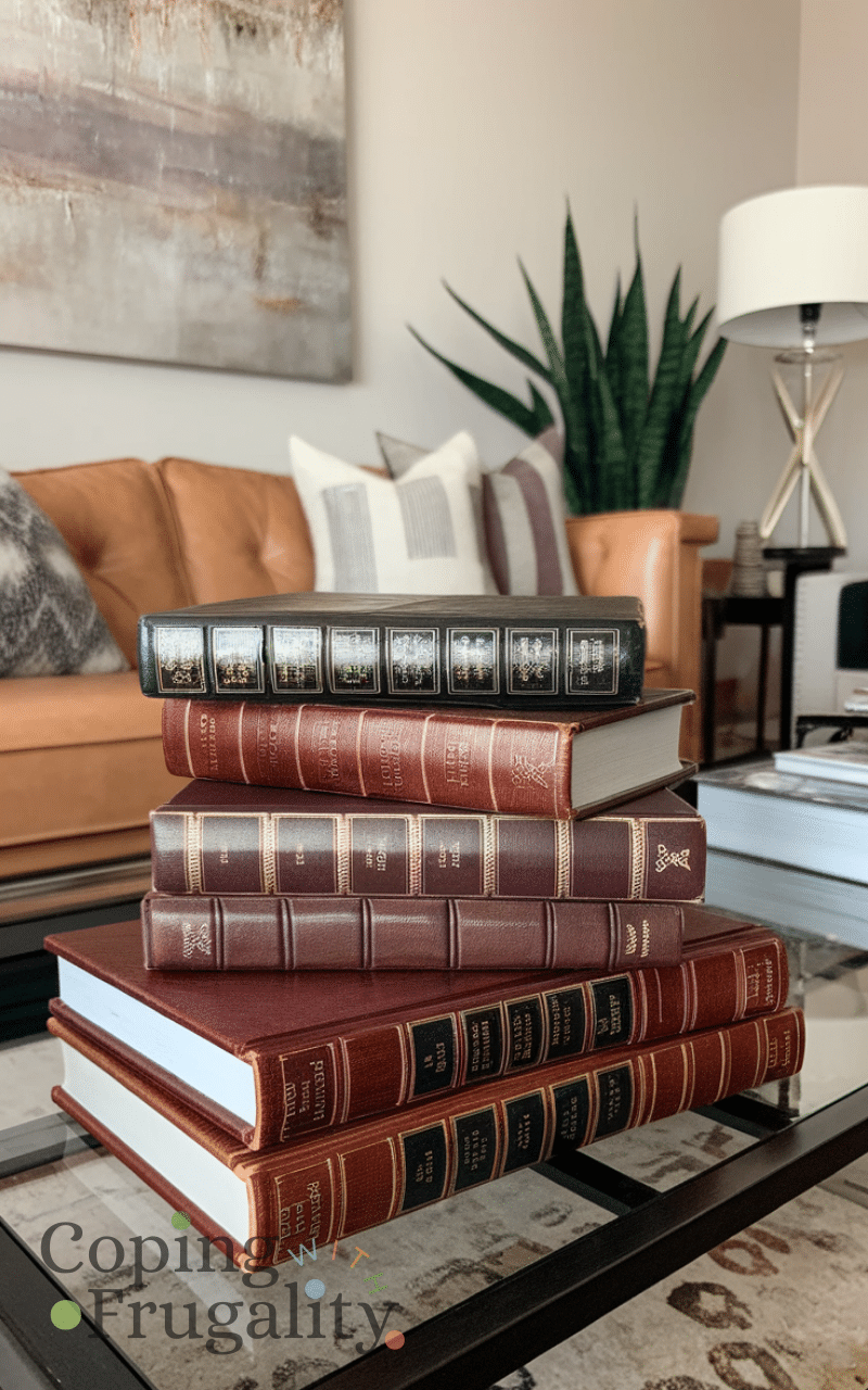 Select a few books with beautiful covers and stack them on a coffee table or shelf. Decorating with fewer items on a budget works perfectly here: a small curated collection adds style without overcrowding surfaces. This approach emphasizes intentional decor and makes your space look thoughtful and organized.