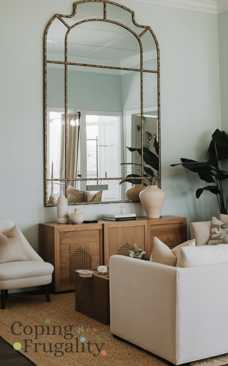 A large mirror not only reflects light but also acts as a decorative piece. Opting for one stylish mirror is a clever way of decorating with fewer items on a budget. It adds depth, opens up the space, and replaces the need for multiple decorative objects while enhancing the room’s style.