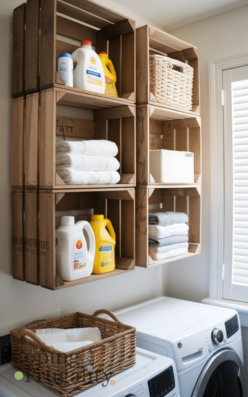 DIY crate shelves are a fun, budget-friendly way to add storage to your laundry room. Wooden crates can be stacked, mounted, or combined to create custom shelving for detergents, towels, or baskets. In small homes on a budget, this DIY approach maximizes vertical space while giving your laundry room a rustic, personalized look. Crate shelves are easy to assemble, versatile, and customizable to fit your specific storage needs. With minimal investment, DIY crate shelves provide a stylish, functional solution for laundry room storage in small homes.