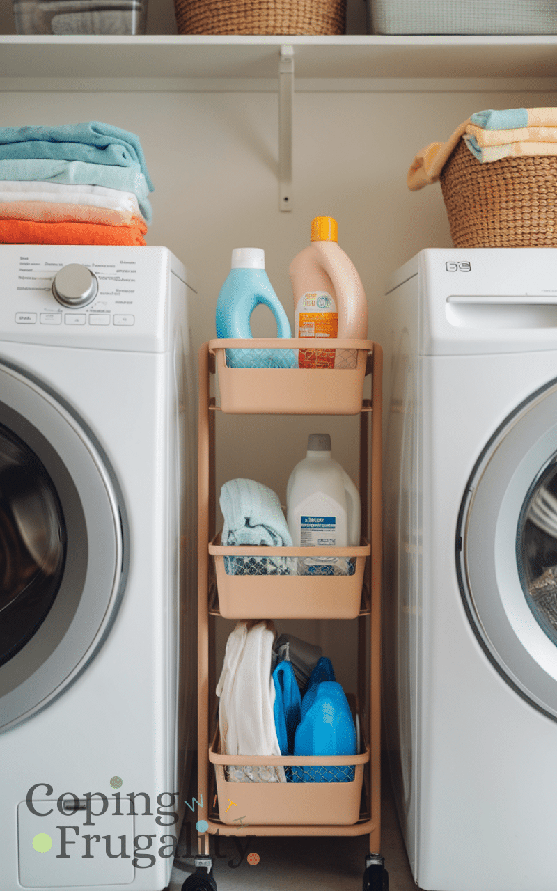 Rolling carts offer portable storage that can move wherever you need it. They are great for holding detergents, dryer sheets, and folded laundry. In small homes on a budget, rolling carts help keep items contained and organized while remaining accessible. You can tuck a slim cart between your washer and dryer or in a corner when not in use. Many carts have multiple tiers, giving you extra storage space without sacrificing floor room. Their mobility makes them an easy, budget-friendly addition to any laundry room storage plan for small homes.