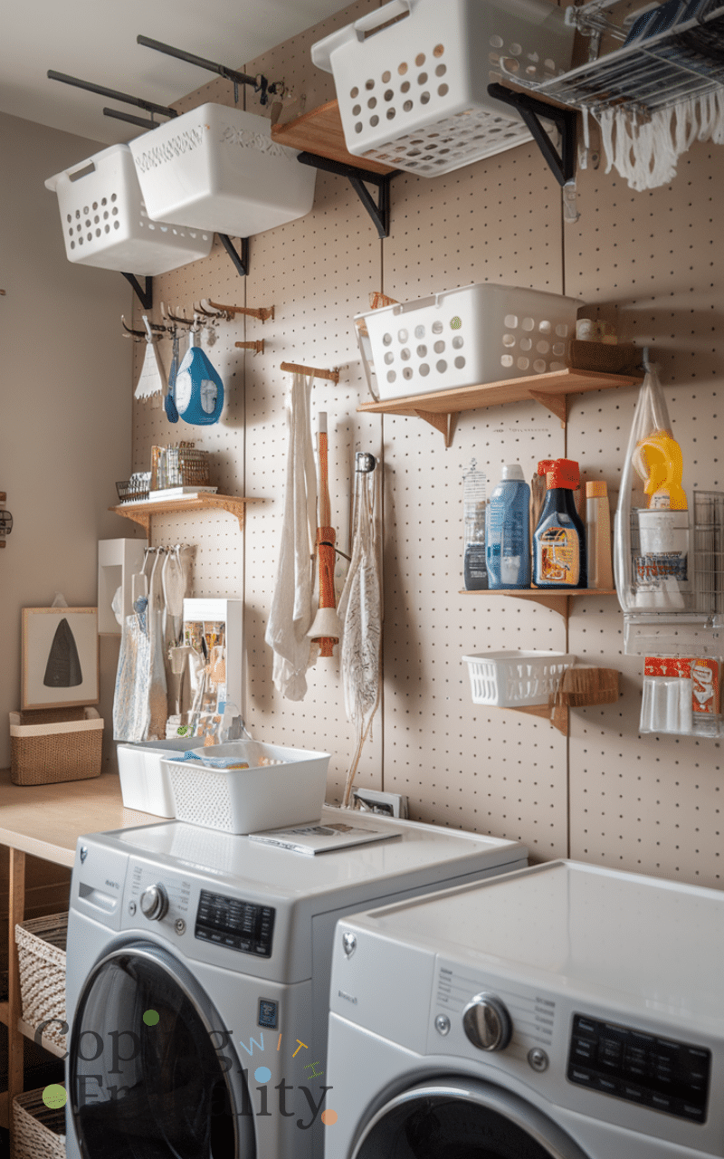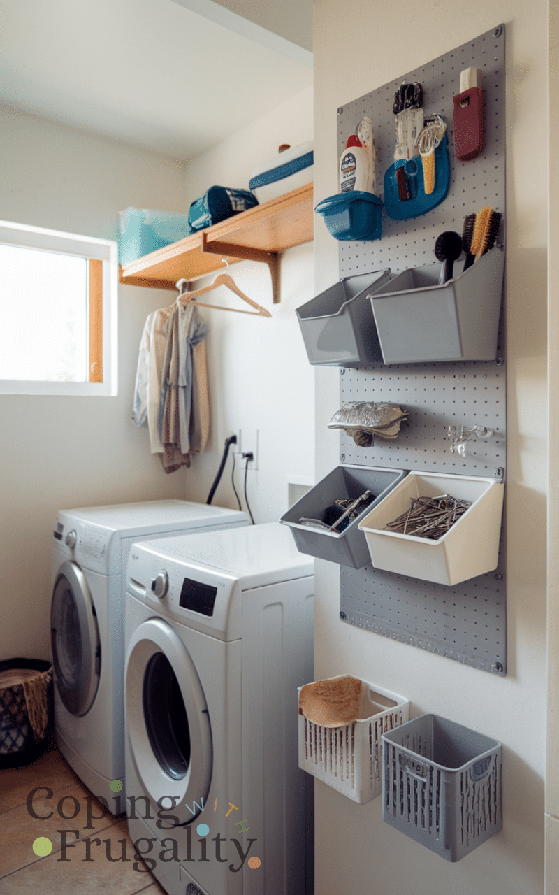 Pegboards are a versatile solution for creating vertical storage. You can hang baskets, hooks, and small shelves to hold laundry tools, cleaning products, or ironing supplies. In small homes on a budget, pegboards help utilize wall space efficiently while keeping items visible and accessible. They can be painted to match your laundry room’s style and rearranged whenever your storage needs change. Using a pegboard ensures that even the tiniest laundry rooms feel organized without spending a lot. This smart and flexible solution is perfect for optimizing storage in small homes on a budget.