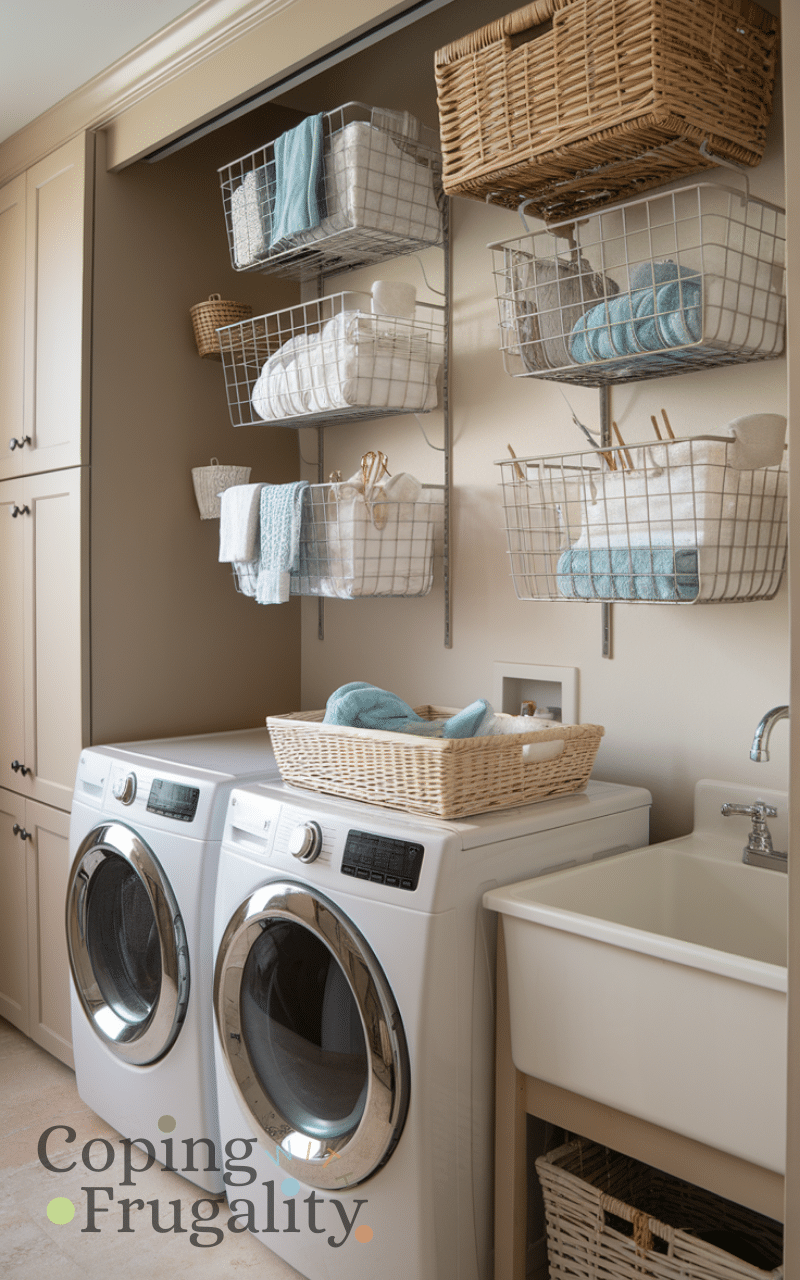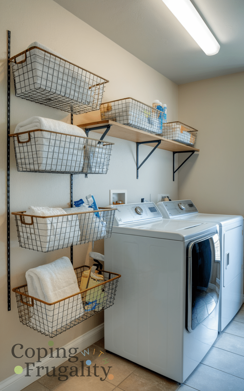 Hanging baskets add both charm and functionality to your laundry room. Mount them on walls or ceilings to store lightweight items like laundry pods, clothespins, or small towels. In small homes on a budget, hanging baskets free up countertop and cabinet space, making your laundry room feel larger and more organized. They come in various materials like wire, wicker, or fabric, offering flexibility in style and storage. Installing hanging baskets is simple, inexpensive, and creates a visually appealing solution for laundry room storage in small homes.