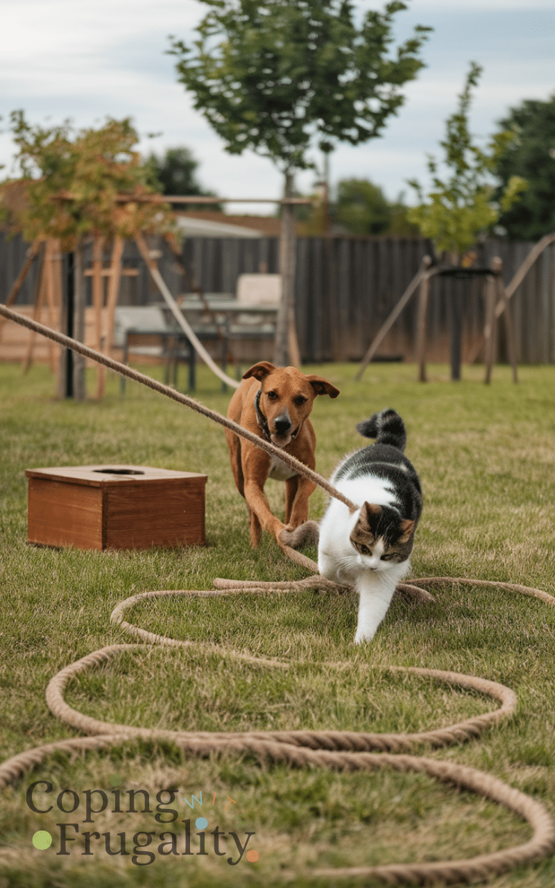 Set up a special area for tug-of-war using old ropes or sturdy fabric and by letting your pets pull and play together they get exercise and strengthen their muscles and by organizing this fun backyard game regularly you create a playful environment where your pets enjoy backyard pet play ideas on a budget for happy animals.
