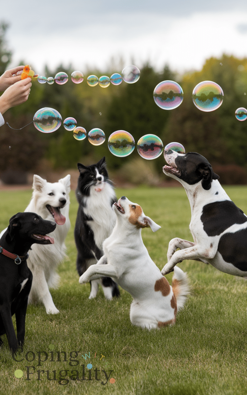 Blow pet-safe bubbles and watch pets jump and pop them and by using non-toxic solutions you keep play safe and engaging and pets enjoy the movement and visual stimulation and this easy activity enhances backyard pet play ideas on a budget for happy animals with laughter and joy.