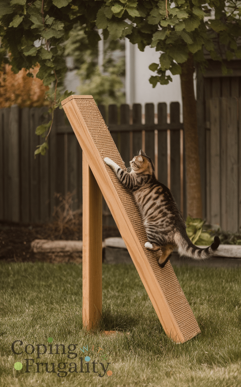 Use old wood or cardboard to create scratching posts and cats will have a safe outlet for their claws and by placing it in the backyard you combine exercise and entertainment and cats enjoy climbing and scratching and this simple addition strengthens backyard pet play ideas on a budget for happy animals while keeping furniture safe.
