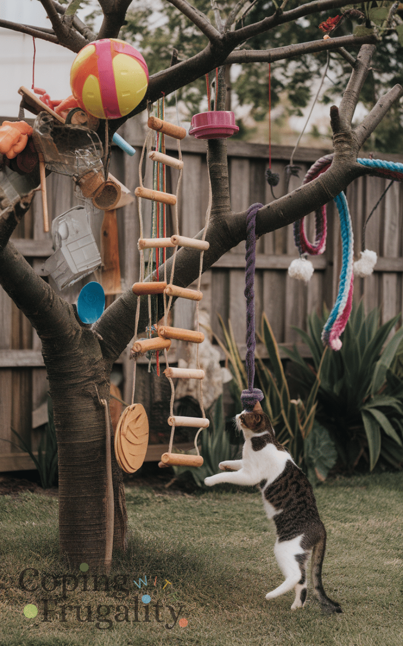 Hang old toys or safe household items from tree branches and pets can jump and play with them and by creating an interactive and playful zone you keep pets physically active and mentally engaged and this simple setup encourages movement and makes backyard pet play ideas on a budget for happy animals exciting and interactive.