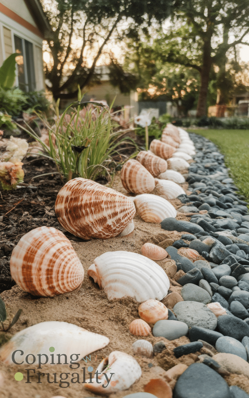 If you live near the beach or love coastal décor then seashells offer charming DIY garden edging ideas on a budget that bring a seaside feel to your backyard. Collect large shells and line them around your flower beds or mix smaller shells with sand and stones for a layered look. The natural shine of the shells catches light beautifully and gives your garden a relaxing beachy vibe that makes every walk through your yard feel like a holiday moment.